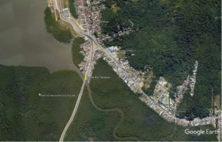 Na figura são apresentados os pontos onde foi feita a medição da cunha salina no Rio Tavares, Florianópolis, SC. Dos 31 pontos de medição para dentro do Rio Tavares, foi possível acessar apenas até o ponto 23 devido a condições restritas de navegação.